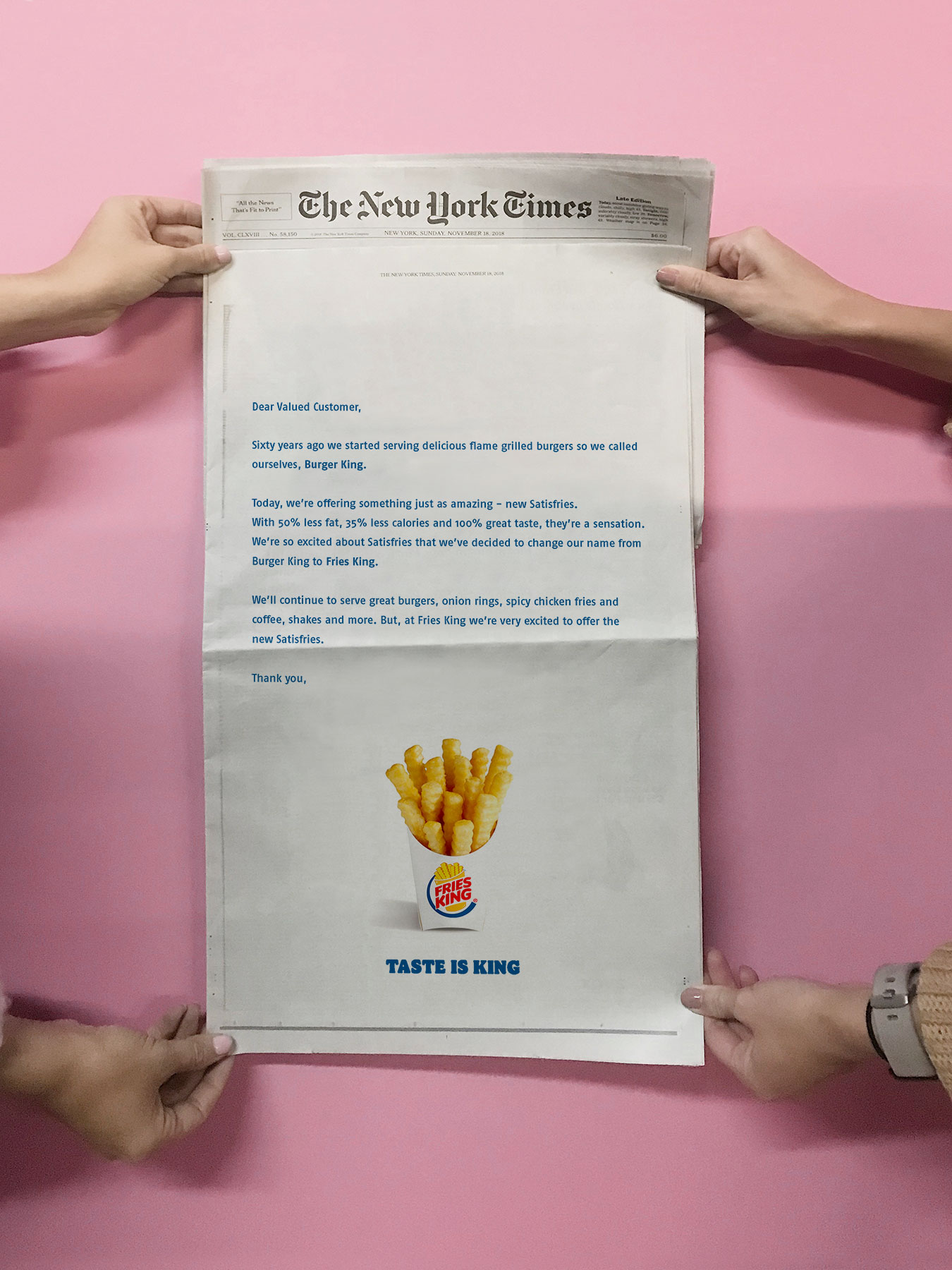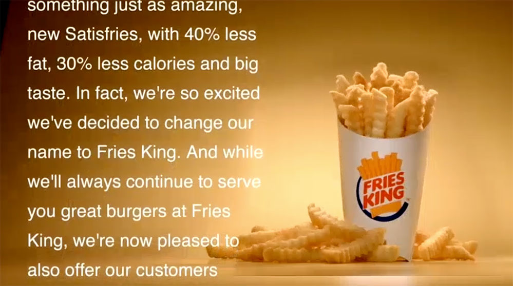 Burger King developed a new french fry, called 'Satisfries'. They're better for you AND they taste great. No really, they do. But, 'Healthy and tasty' was a tough message for people to believe from a fast food giant. To get people to go instore and try these new fries, we had to do something brave.