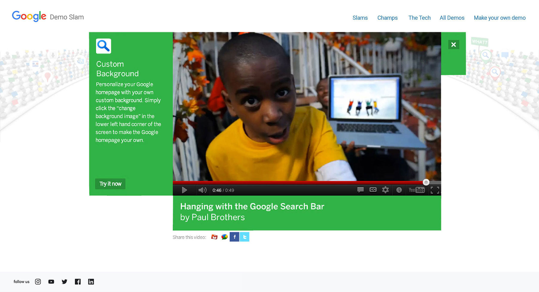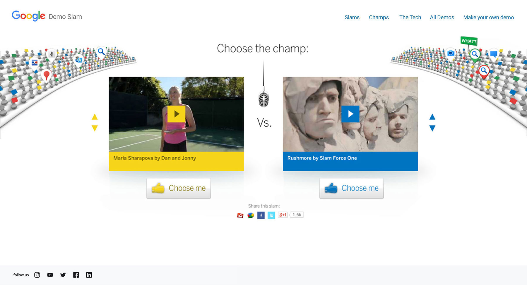 We knew people would love these Google products as much as the engineers when they could see how each influneced their lives. So we made demoslam.com - a place where demo-ing Google products was fun, inventive, weird, meaningful, silly and most importantly, competitive.