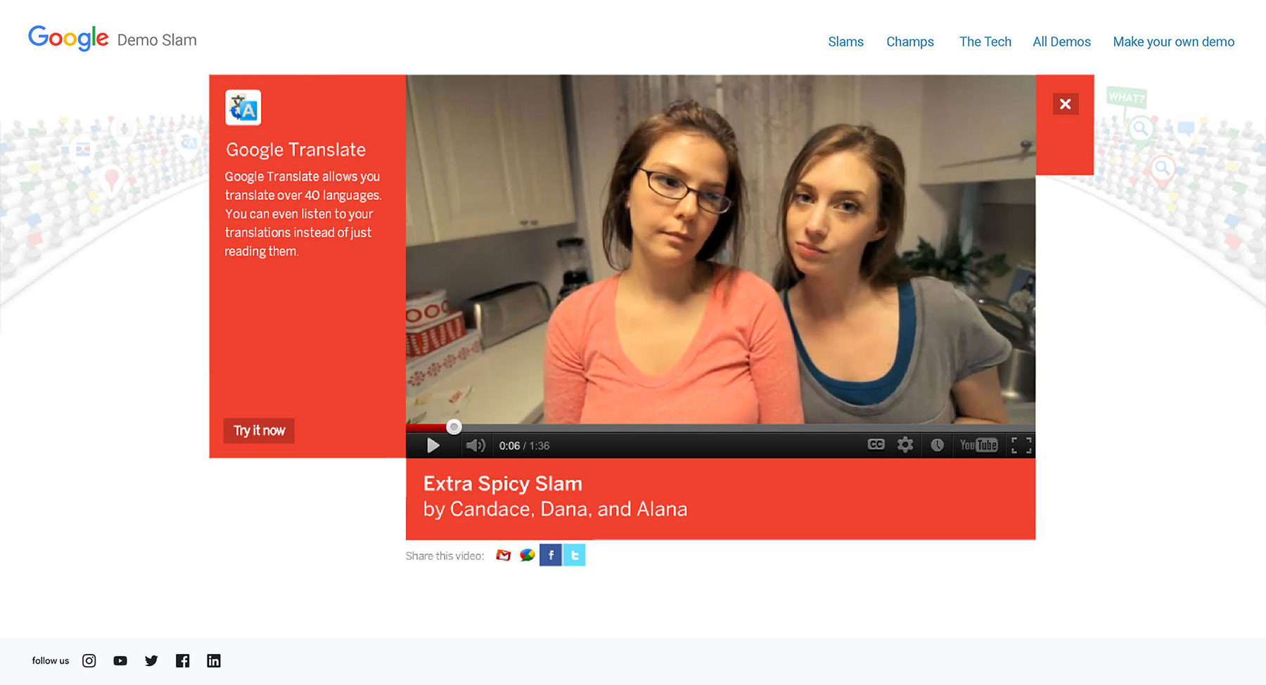 We knew people would love these Google products as much as the engineers when they could see how each influneced their lives. So we made demoslam.com - a place where demo-ing Google products was fun, inventive, weird, meaningful, silly and most importantly, competitive.